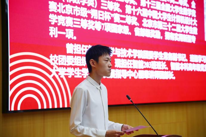 张兆隆作为首届“AI之光”院长奖章获得者,讲述了自己在北科潜心求学的四年经历,与新生们分享了两点在大学生活中很重要的事情:一是认真学习理论知识,注重实践能力的培养;二是在学习之余,全面发展。他鼓励同学们脚踏实地、稳扎稳打迈进,并祝愿同学们今后学业有成,一路生花。