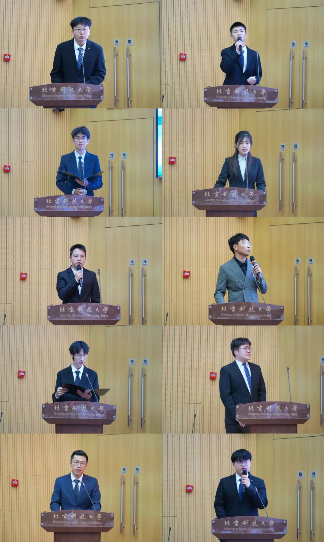 陈昊炜以“人工智能新质生产力赋能中非矿业协同发展”为脉络,用科技力量架起数字丝绸之路的创新桥梁;张灿彬以“仰不愧天、俯不怍人”为人生注脚,用严谨的科研态度诠释了科技工作者的品格高度;黄俊智从“学术突破、社会服务、青年责任、精神谱系”四维立体呈现本科成长,勾勒出新时代青年的完整画像;孙鑫业以奉献为墨、以实践为笔,用爱心和行动照亮社会,让技术创新充满人文温度;王宝杰聚焦“心之所向,无问西东”的科研定力,初心不改,一心向党;李冰冰坚信征途漫漫亦灿灿,用“技术+温度”诠释青年担当;吴百强以“跬步积千里”的务实精神让创新热情与公益情怀同频共振;徐衍睿博士以“物理仿真赋能智能工业”为切入点,系统解读了虚实映射智能仿真底座的应用范式,展现出从实验室到生产线的转化能力;张帅以“德才兼备、知行合一”为准则,扎实基础,争做砥砺奋进的“领头雁”;周湘洋用“感恩、充实、快乐、挑战”凝练硕士时光,用真实的网格交互打破虚拟与现实的界限;黄文腾以“科研方法论”为核心,分享了从本科生到硕士生的进阶之路,用扎实的学术积累为答辩会画上圆满句点。