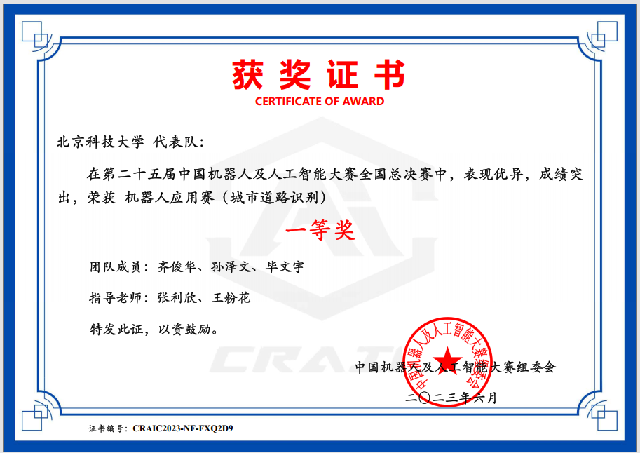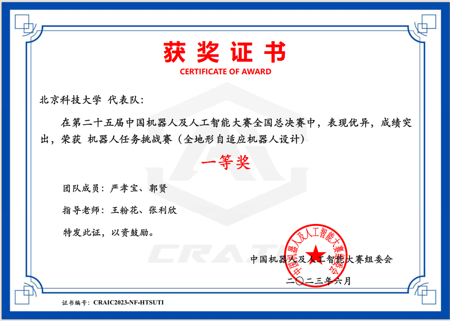 经过国赛的激烈角逐,在王粉花、张利欣老师的指导下,全地形自适应机器人设计赛道的严孝宝、郭贤团队,城市道路识别赛道的齐俊华、孙泽文、毕文宇团队荣获全国一等奖。