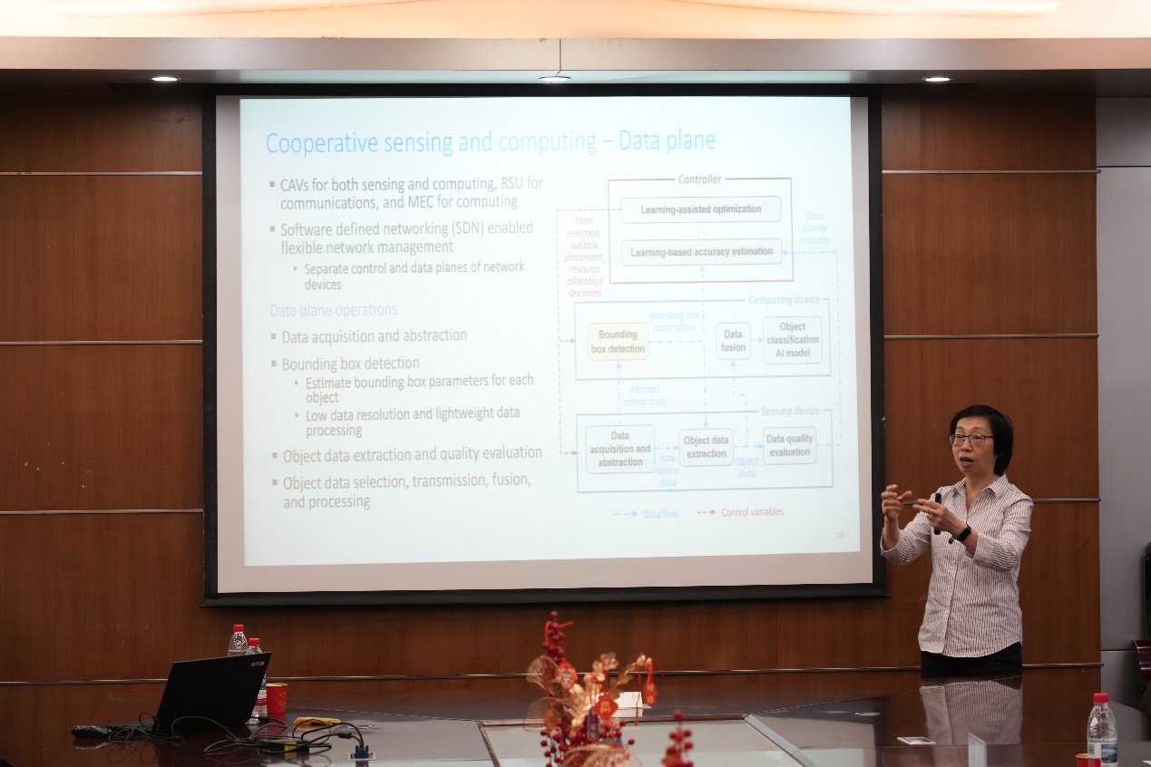 本次讲座庄卫华教授以面向5G/6G时代的人工智能技术为背景,深入探讨了“面向精度感知的车联网协同感知与计算”这一前沿主题。她指出,随着智能网联汽车应用的不断扩展,可靠的环境感知成为实现自动驾驶安全运行的核心技术之一。讲座围绕智能网联汽车与路侧基础设施协同感知的关键挑战展开,详细介绍了如何通过监督学习模型,构建目标识别精度与感知数据质量之间的映射关系,以实现更为高效的感知数据筛选。同时,她将协同感知任务建模为一个联合优化问题,综合考虑数据选择、任务部署与资源分配,旨在满足时延与精度约束下最小化系统资源消耗。讲座内容深入浅出、逻辑严密,不仅展现了人工智能与智能交通深度融合的广阔前景,也为在场师生打开了智能网联感知技术的新视野。