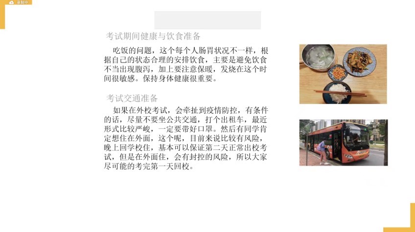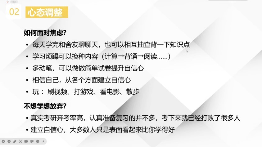 考研成功上岸的研究生学长戴放、荆良首先为同学们介绍了最后阶段的备考经验,从考前准备、考时心态、应试技巧等方面进行事具细微的分享。亲切的叮咛,真诚的祝愿,让各位考研学子深深感受到来自前辈们的温暖,紧张的内心舒缓了不少。