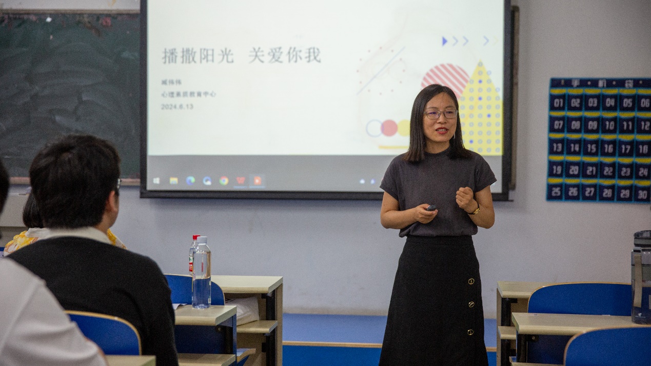 臧伟伟教授以“播撒阳光 关爱你我”为主题展开心灵阳光大讲堂,她与心理委员们分享了危机干预中朋辈的重要性,以及危机干预中的工作流程及误区,倡导学生互相关爱,相互支持,营造良好氛围。