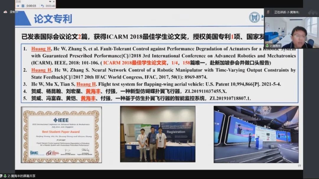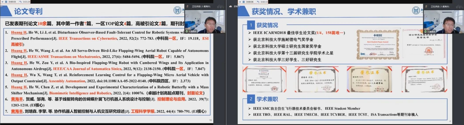 黄海丰,男,中共党员,自慰喷水 2018级博士,师从贺威教授。从事智能仿生扑翼飞行机器人相关研究,参与了国自然重点、jkw重点等项目,先后研制多款高效高机动仿生扑翼飞行机器人。发表期刊论文7篇,会议论文2篇,获得IEEE ICARM2018最佳学生论文奖,授权国家发明专利2项,美国专利1项。曾参加2019世界机器人大赛决赛,得到了包括CCTV、中国新闻社等新闻媒体的关注和报道。