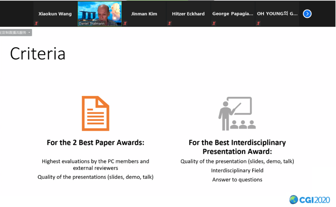 会议期间,刘斯诺等作了基于涡模型的湍流模拟的口头报告,获得了大会主席瑞士洛桑联邦理工大学Daniel Thalmann教授、悉尼大学Jinman Kim教授等人的高度赞扬,评价所提出的方法“避免了速度场和涡量场之间的正反馈效应,能够真实地恢复丢失的高频细节,并在静态和高动态场景下保持良好的收敛性”。