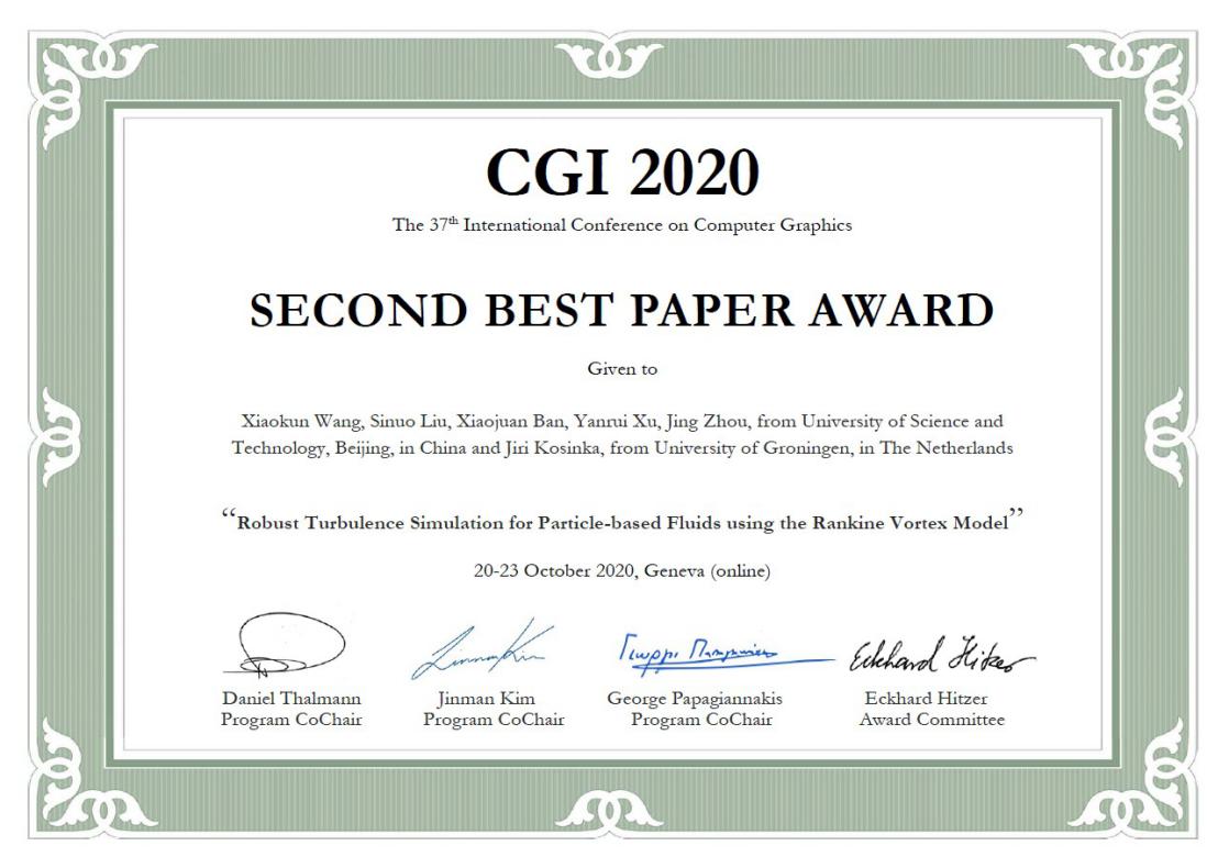 人工智能研究院青年教师荣获我校首个计算机图形学国际会议(CGI2020) 最佳论文奖