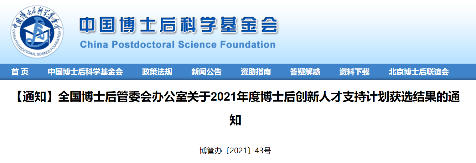 5月27日,中国博士后科学基金会正式发布了《全国博士后管委会办公室关于2021年度博士后创新人才支持计划获选结果的通知》(博管办〔2021〕43号),经过激烈竞争,最终确定全国共计400名获选人员,人...
